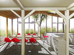 Afin de gérer des déficiences d'ordre thermique, l'extension existante de la maison sera remplacée par un ouvrage en ossature bois et une nouvelle toiture en zinc. Une verrière avec châssis en aluminium, qui suivra le rythme d'implantation des montants de l'ossature bois, permettra d'isoler l'ensemble.
